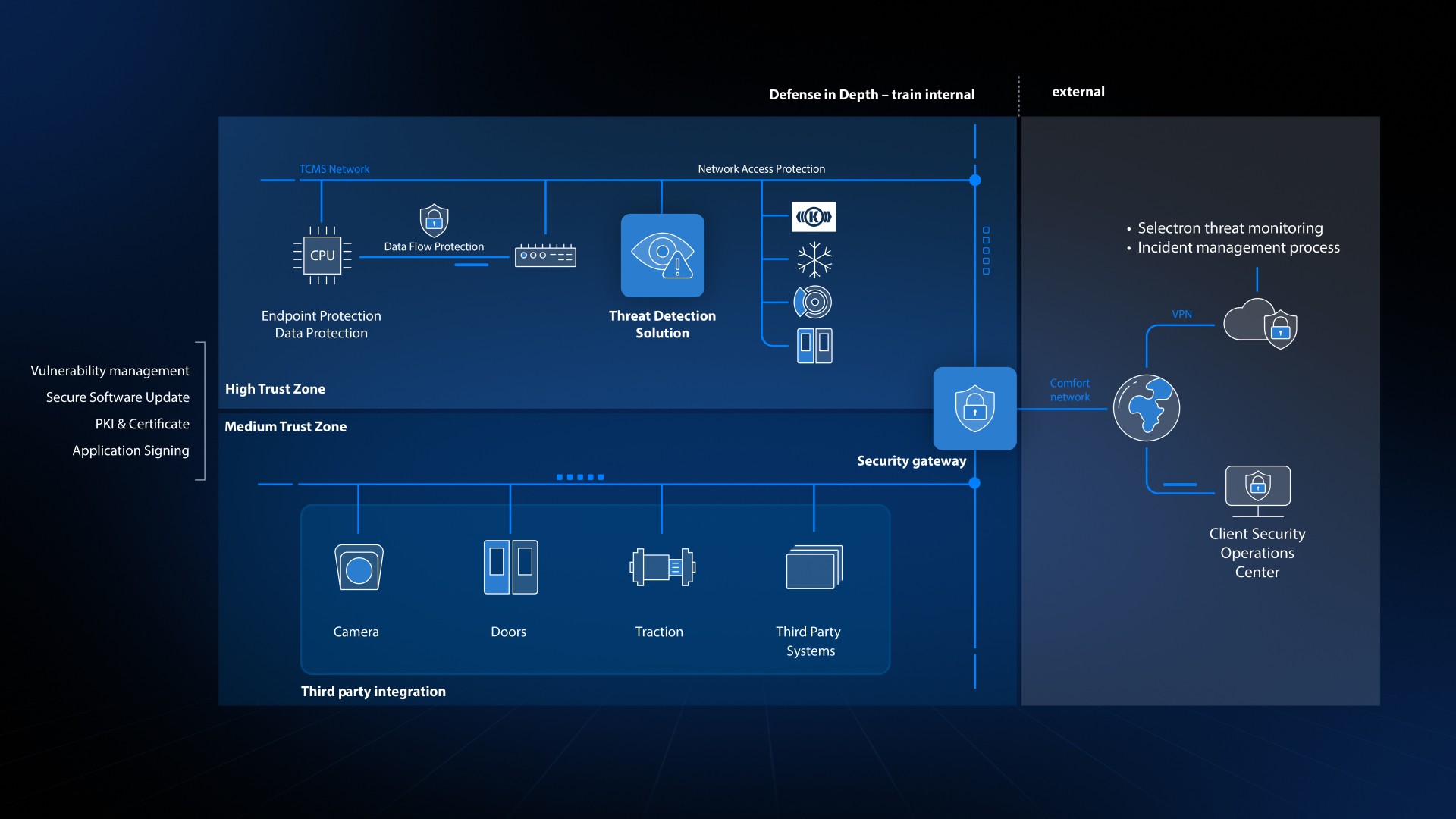 Absolute security in cybersecurity cannot be guaranteed. With the Selectron Threat Detection Solution (TDS), we take an important step in that direction. A key factor is our TDS, which detects potential threats at an early stage—specifically developed for the requirements of railway operations and in accordance with current cybersecurity standards.